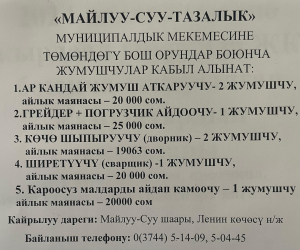 "Майлуу-Суу-Тазалык" муниципалдык мекемесиндеги бош орундар боюнча маалымат