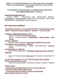 Майлуу-Суу шаарынын мэриясы улук жана кенже кызмат орундары боюнча кадрлар резервине талапкерлерди киргизүүгө ачык конкурс жарыялайт