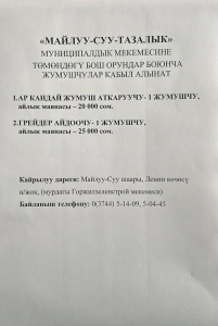 " Майлуу-Суу Тазалык" муниципалдык мекемесиндеги бош орундар