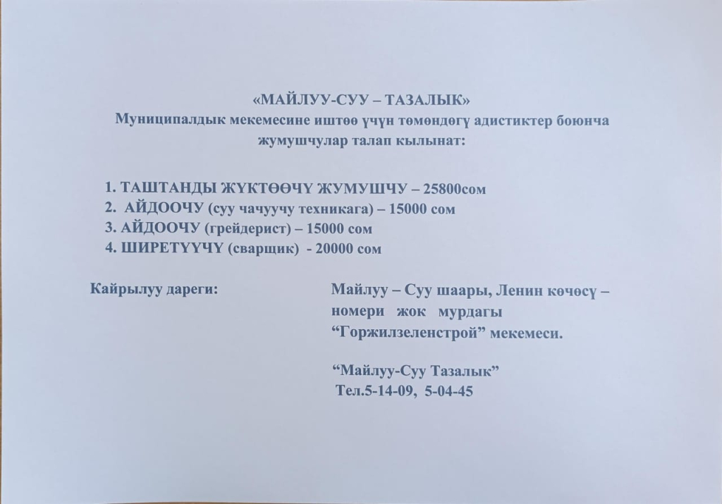 "Майлуу-Суу-Тазалык" муниципалдык мекемесине жумушчулар керектелет