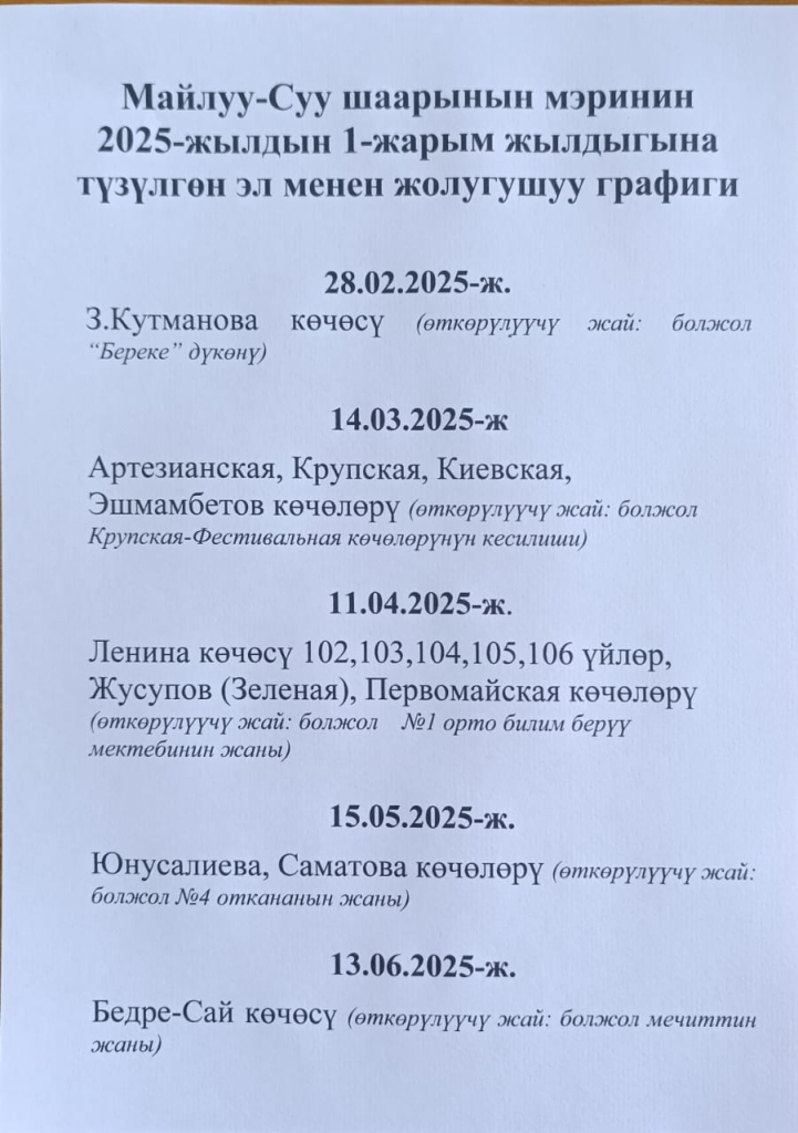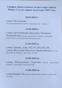 Кыргыз Республикасынын Президентинин Администрациясынын 2024-жылдын 29-майындагы чыгыш № 20-4720 сандуу “жергиликтүү өз алдынча башкаруу органдарынын башчылары айына бир жолу эл менен жолугушуу өткөрүү” тапшырмасын аткаруу максатында Майлуу-Суу шаарынын мэринин 2025-жылдын 1-жарым жылдыгына карата эл менен жолугушуу графиги түзүлүп, бекитилген. Мэрдин эл менен жолугушуусунун максаттары жарандардын негизги көйгөйлөрүн аныктоо, көрктөндүрүү, транспорт, экология, коопсуздук, турак-жай, коммуналдык чарба жана башка тармактар боюнча баарлашуу, шаардын инфра-түзүмүн жакшыртууга багытталган сунуштарды жана демилгелерди чогултуу болуп эсептелет. Ошондой эле өз алдынча жергиликтүү органынын ишинин ачык-айкындуулугун жогорулатуу, ишенимди бекемдөө жана мэрия менен жарандардын ортосунда натыйжалуу байланышты түзүү.