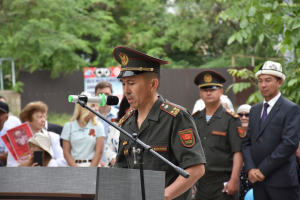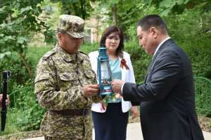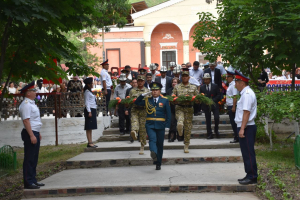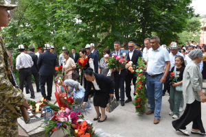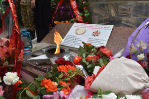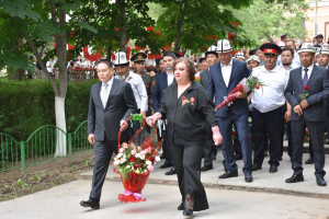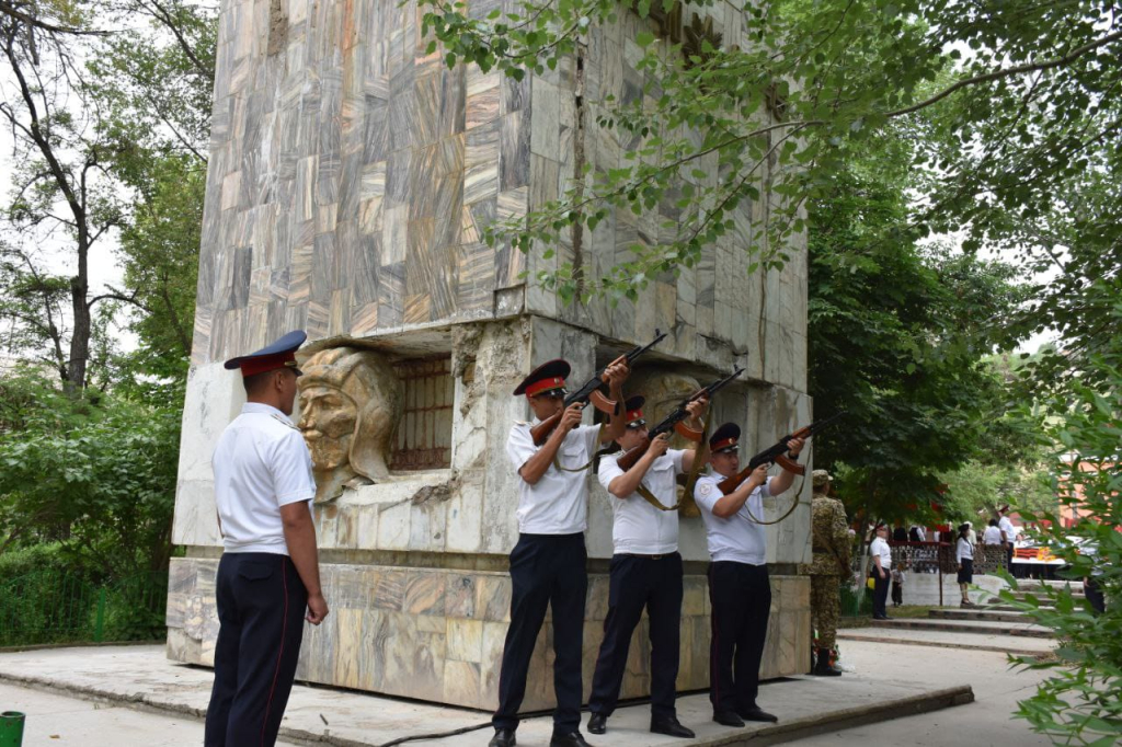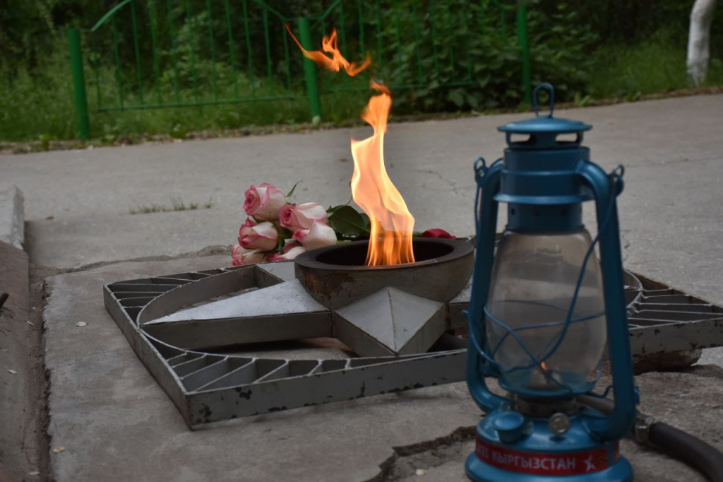 Эскерүү иш-чараларынын алкагында “Жеңиш” сквериндеги өчпөс отко от жандырылды жана гүл чамбарлар коюлду.