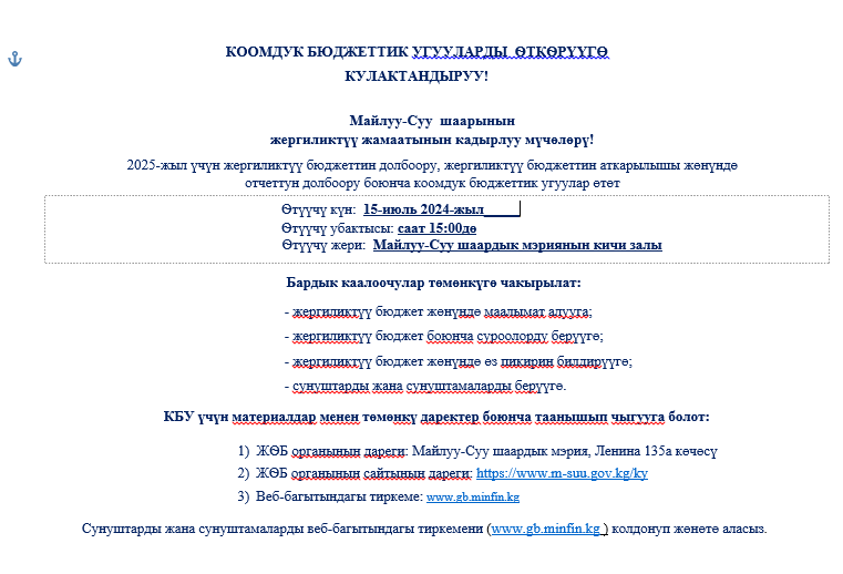 Майлуу-Суу шаарынын 2025-жылга карата бюджеттик угууларды өткөрүү жөнүндө