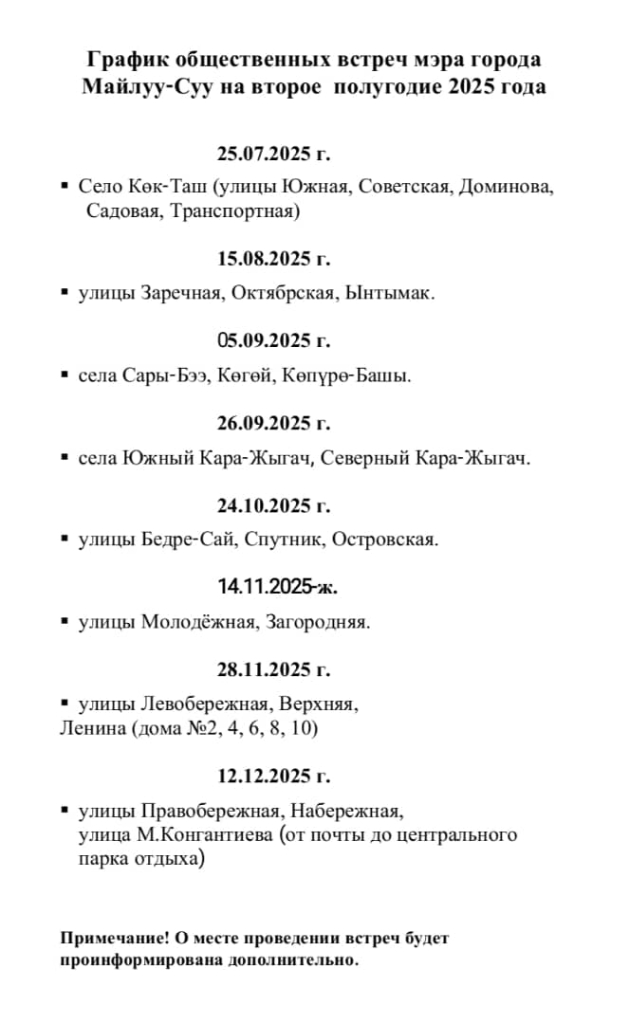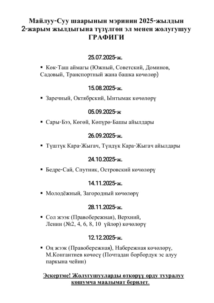 Майлуу-Суу шаарынын мэринин 2025-жылдын 2-жарым жылдыгына түзүлгөн эл менен жолугушуу графиги
