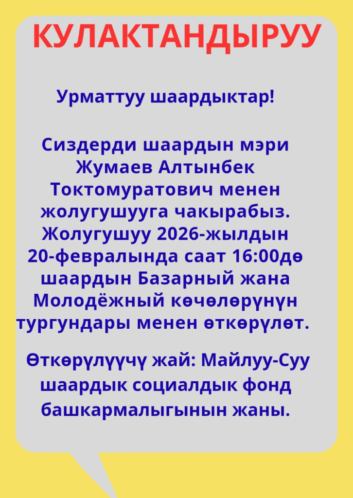 Сиздерди шаардын мэри А.Т.Жумаев менен жолугушууга чакырабыз.