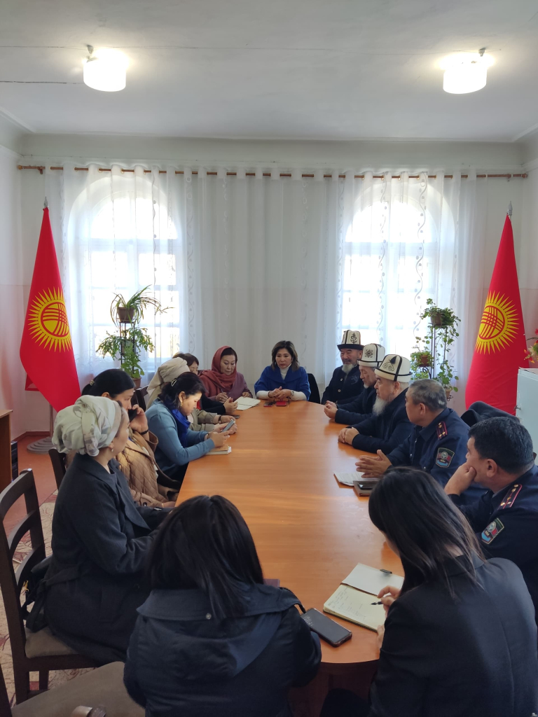 Тегерек столго мэрия, аксакалдар, аялдар Кенештери, шаардын имам-хатиби, ШИИБ жетекчилиги, ЭСКМБ жетекчиси, окуу жайлар катышты. Үй бүлөлүк зомбулук боюнча көйгөй болгон маселелер талкууланды, кеп кенештер, пикирлер айтылып, аталган көйгөйлөрдүн алдын алуу, чечүү жана күрөшүү боюнча тапшырмалар берилди.