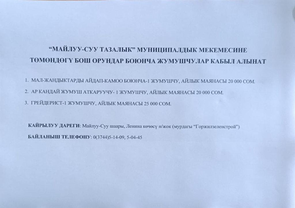 "Майлуу-Суу Тазалык" муниципалдык мекемесине жумушчулар кабыл алынат.